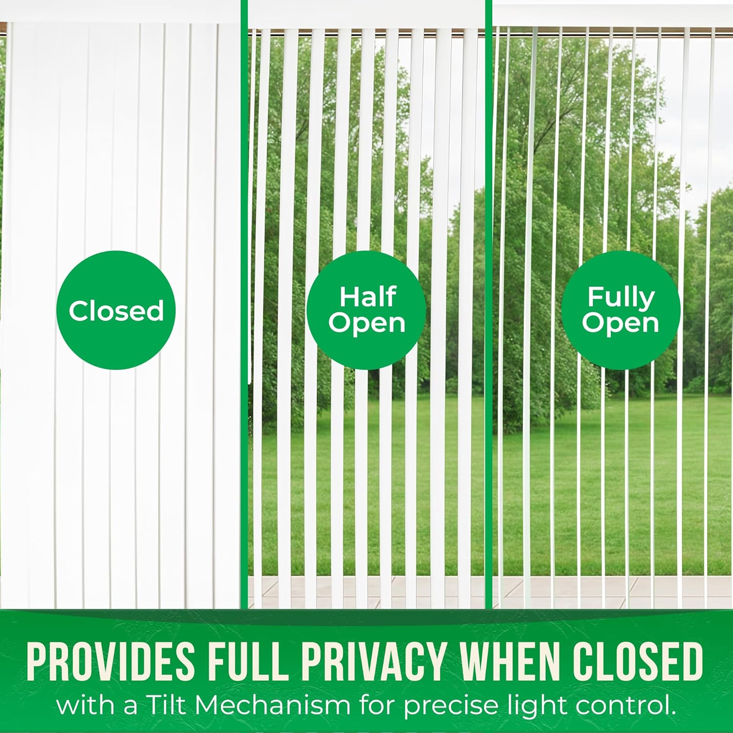 Enjoy flexible light management with vertical blinds that rotate to let in soft daylight, block harsh sun, or close fully for complete privacy. Easily adjust the vinyl slats to match your mood or time of day. Ideal for any room that you may have a sliding door such as bedrooms, living rooms, and offices, these blinds offer both functionality and comfort in any setting.